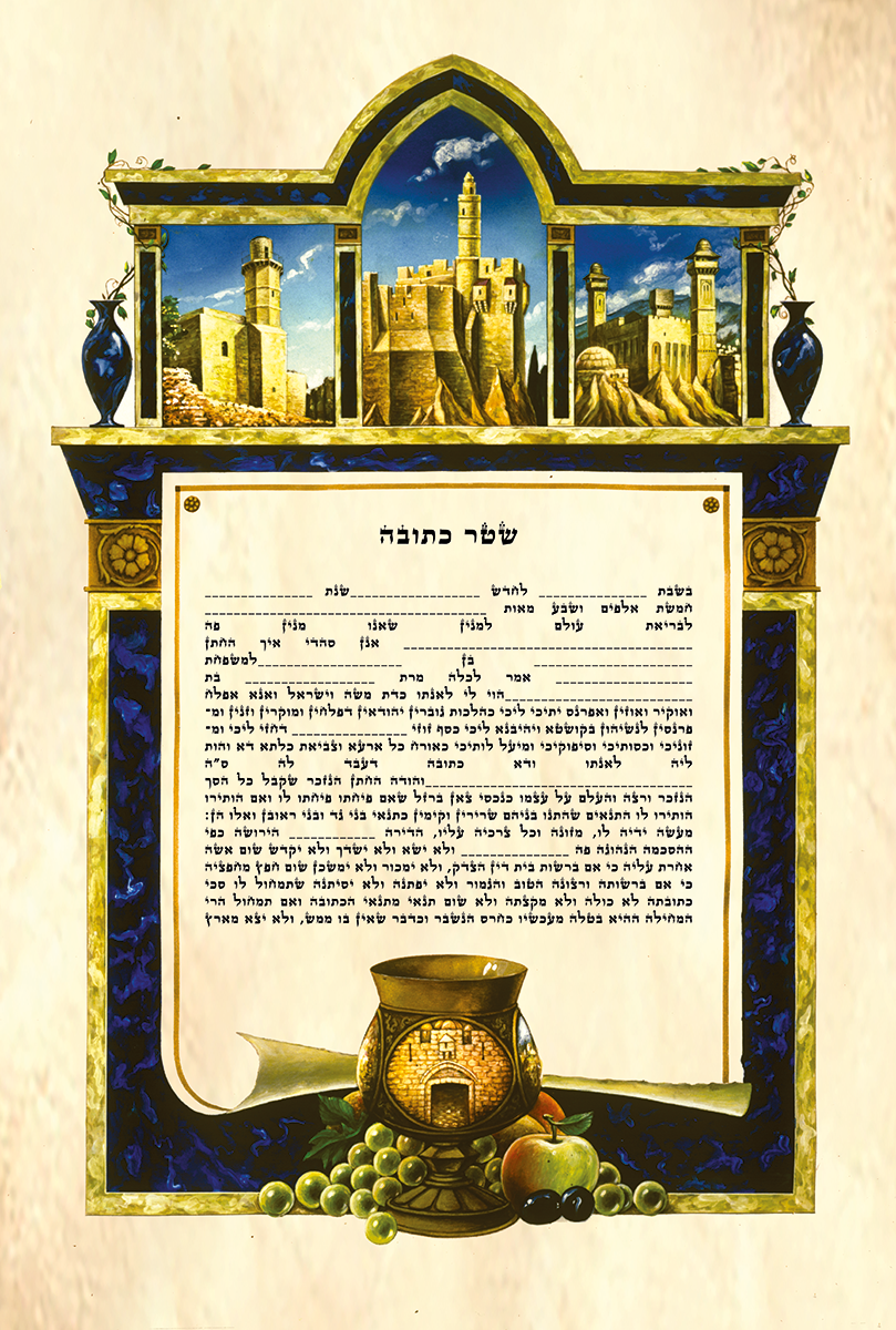 הכתובה "חומות ירושלים" היא יצירת אמנות מיוחדת הניתנת לכלה מידי החתן בטקס החופה. היא מגיעה בשתי אפשרויות הדפסה: על קלף אמיתי או על נייר איכותי.